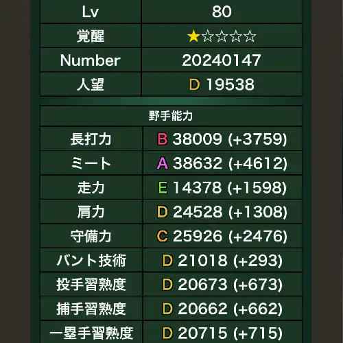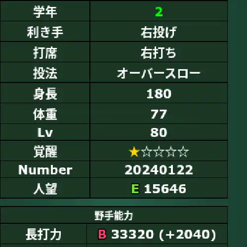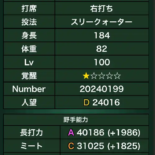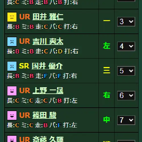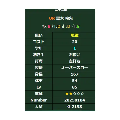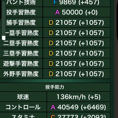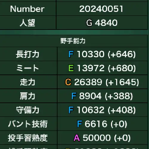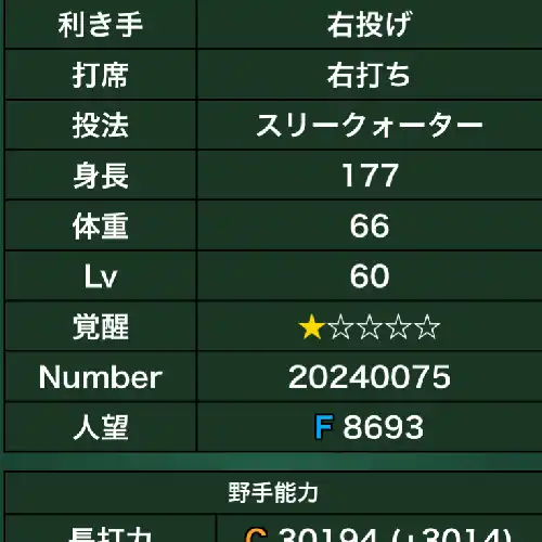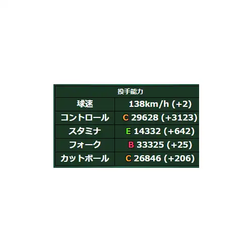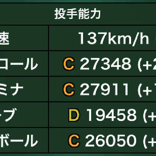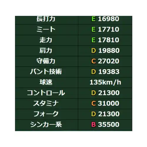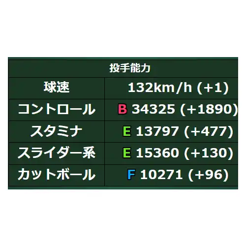 石切大仏学園さん (9ndr1ksq)2025/8/26 11:22削除ここ改めて書くまでもないことですが、とにかくコントロールが圧倒的に重要です。Bに近いC(目安として30,000以上)ならまだ何とかなりますが、それ以下は練習試合要員です。上の方に貼ったウチの今のエースはコントロールAですが変化球がショボいのが難点です。
