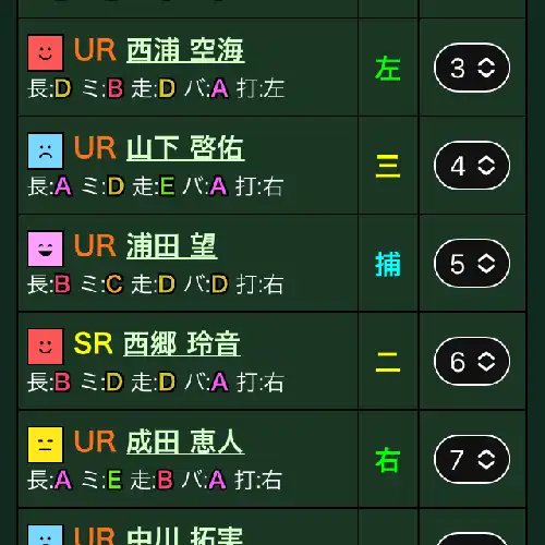 國學院さん (9iquvvyb)2025/8/27 15:28削除なるほどね、けど2番は少し早いと思います長打力Aの2人を3番4番か4番5番がいいと思います
